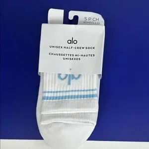 Alo socks half crew unisex women 5-7.5 men 3.5-6 baby blue logo