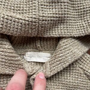 Cozy knit sweater with hood. Button-up front. Pom-pom detail on hood.