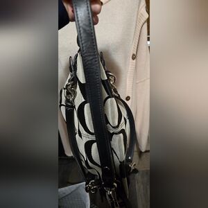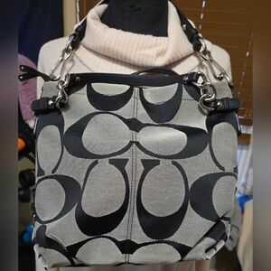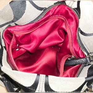 Coach Purse Signature Brooke Hobo Shoulder bag, zip closure and a detachable shoulder strap. The bag is made of canvas material with signature C's and red lining. It has two inner pouch pockets and one inner zipper pocket. Good overall condition. Wear on corners, see photos.