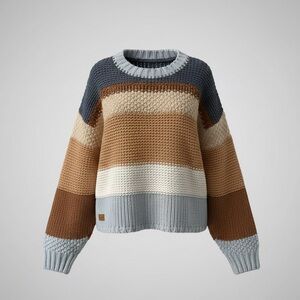 Stay cozy and stylish with this colorful striped women’s sweater. Featuring a blend of blue, brown, cream, and tan, this sweater is perfect for any casual outing. Its soft knit fabric ensures comfort and warmth.