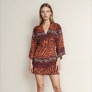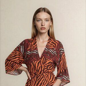 Bold and stunning Banana Republic Issa London Collection dress featuring a vibrant abstract zebra-inspired print in rich orange, rust, black, and white tones. This dress has a flattering kimono-style silhouette, wide flowing sleeves, a deep V neckline, and a cinched elastic waist with tie belt for a beautiful, feminine shape.