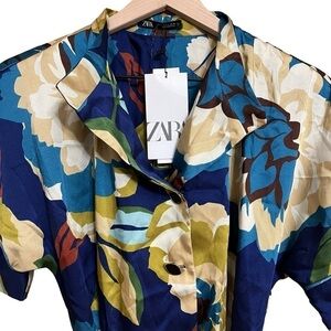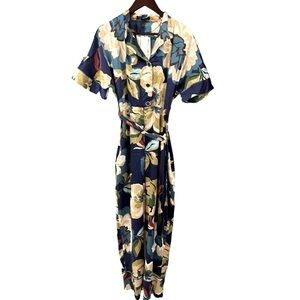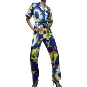 Zara Floral Silky Belted Short Sleeve Jumpsuit. Blue Green. Size L #969 NWT
