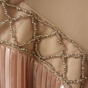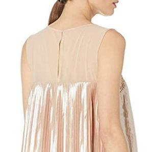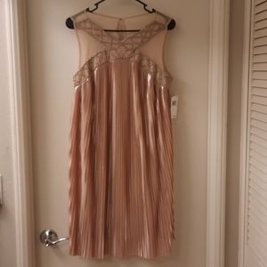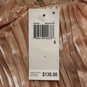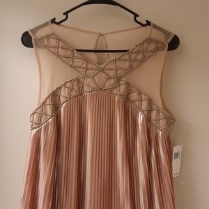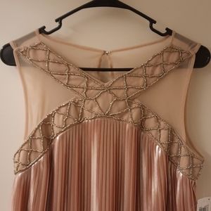 NWT, gorgeous size 6, sleeveless with beaded/mesh front. Mesh back with keyhole and eyehook closure. Color is Beige/Silver. Length approx 38", pit to pit 17.5" flat. Loose fit, fully lined.
