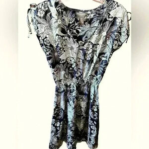 Two shades of green in a beautiful floral print. Shoulder have cinch ties that tie into bows. V neck, elastic waist. No belt. Slits at hem. Made in India. Pit to pit 19” across, waist 15”, length 39”.