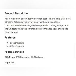 Hello, miss new booty. Booty-scrunch tech is here! This ultra-soft, stretchy fabric moves effortlessly with you. Seamless construction delivers targeted compression to hug, sculpt, and lift while the scrunch detail enhances your shape like never before.
