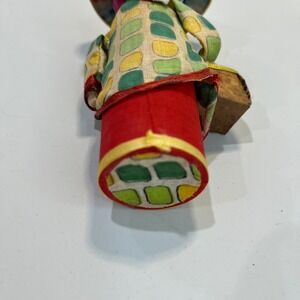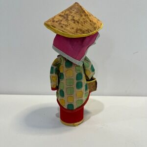 Charming vintage doll exuding a classic Asian aesthetic. Dressed in a patterned top and solid base, this piece is accentuated by a traditional woven conical hat and a miniature basket accessory. Its hand-painted features add to the doll's allure, making it a distinctive collectible. Ideal for adding a touch of cultural elegance to a display shelf or as a unique piece in a vintage doll collection.