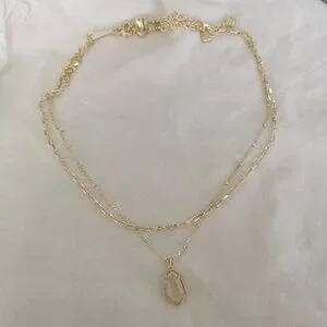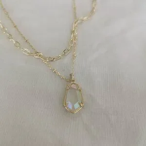 Double up on the glamour with the Alexandria Gold Multi Strand Necklace in Iridescent Clear Rock Crystal. A fresh take on our classic Alex silhouette, you can’t go wrong when you wear this two-in-one necklace with a link-style chain, paired with a striking stone pendant on a satellite chain.