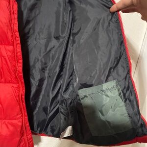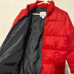 Full zip old navy womens jacket coat winter jacket coat Red full zip 100 % nylon shell and 100 % polyester lining. Pictures show all good condition :) Red outside black inside with a inside pocket 16-16 1/2 inches shoulder to shoulder and shoulder to the bottom 25 inches :)