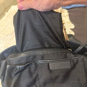 Chic and versatile shoulder bag. Features black leather with tan straps. Ideal for everyday use. Clean lining & zippers work. NO CALL OUTS! No, the scarf is not included.