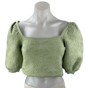 ZARA Light Green Jacquard Knit Short Puff Sleeve Square Neck Crop Blouse Top S