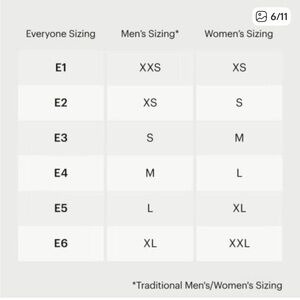 - Uses the Everyone size scale, which ranges from E1-E6 and corresponds with women's and men's sizes. (see photo)