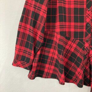 Susan Graver Top size 2X Red Black Plaid Preppy Asymmetric Hem Button Down