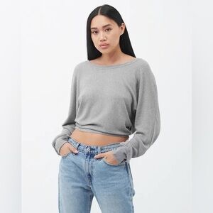 Joah Brown Slouchy Dolman off the shoulder ivory rib sweater knit fabric frayed