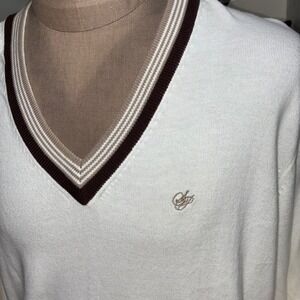 Sean John Mens V Neck Sweater Cream Brown Trim Logo Size XXXL