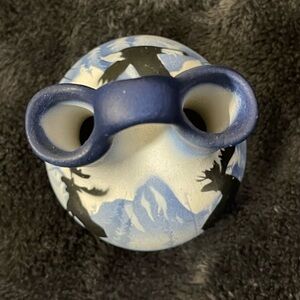 Small blue wedding vase measures at 5" H x 2.2" W spout to spout. From the American Heritage Collection, signed and stamped by R. W. Adamson. Theme of an eagle and moose in the forest. Gorgeous hand painted vase in amazing vintage condition. Native American pottery. 1/1