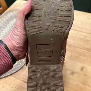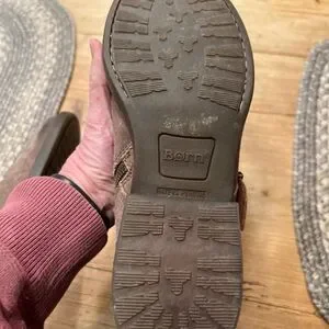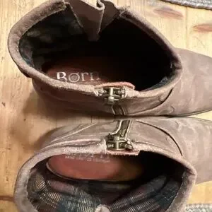 These are the Born Regis women's ankle boots in light brown distressed leather. They feature a western or moto-inspired design with a side zipper and buckle accents