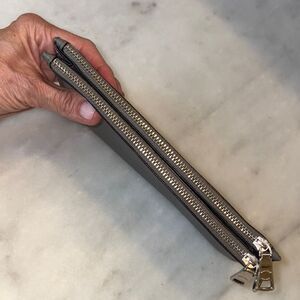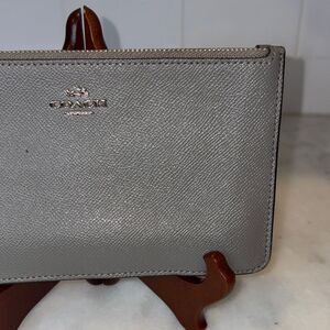 Expandable middle compartment with magnetic closure is perfect for you cell phone. Back zipper compartment has card slots and a slip pocket. Front zipper compartment is an open section. Silver hardware. No strap, but one could easily be added. This is big enough to be carried as a clutch, but is also great to throw inside a carry all tote. Perfect for the grab and go!! Approximate measurements - 8.25" x 4.75" Photos are the best description of the condition of this Coach beauty. Zoom on photos, ask questions and make an offer. Next day shipping.