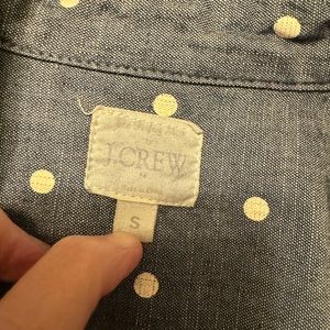 J. Crew Shirt SZ SM. Measures 26" in length from shoulder to bottom of hem. Bust measures 20" from armpit to armpit laying flat. 100% Cotton. Blue Denim with White Polka Dots. Full Front Button closure. Buttons at sleeve ends. There are two small spots on the front right they are small and not very noticeable. I have taken a picture of them. This is a very cute shirt. Could be worn open with a tank underneath.