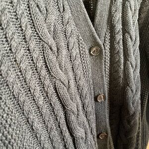 Elegant charcoal cardigan with cable knit design. Perfect for layering and adding warmth. I just put it on the hanger to take pictures, its not how I store sweaters so no worries about that. Quince is great, nice weight and super cozy. Love it.