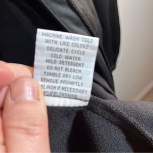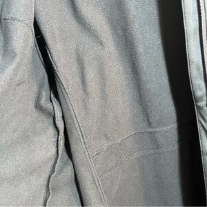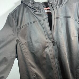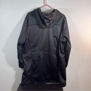 Full-zip, hooded, long-length raincoat/windbreaker. Water-resistant outer shell with warm fleece lining. Zippered pockets. Perfect for 3-season wear. All-weather, athleisure, outdoor, transitional, active. RN# 121854.