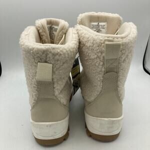 The Women's Corie Shearling Hiker Winter Boots by Universal Thread in size 6 are a stylish and practical choice for cold weather. These lace-up boots feature a round toe, faux fur lining for warmth, and a cream color that is versatile for casual occasions. The durable upper material of 20% polyester and 80% EVA ensure long-lasting wear, and the medium width provides comfort for all-day wear. Made in the United States, these winter boots are perfect for staying cozy and chic during the colder seasons.