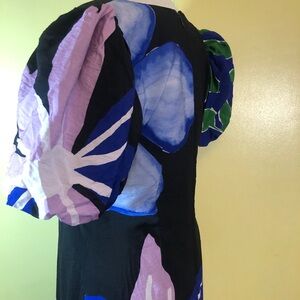 Maxi Dress featuring a bold floral design. Highlights include pink and blue accents on a black background. Perfect for a stylish look. Zipper up back.