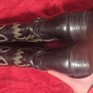 Elegant dark leather boots with intricate stitching. Ideal for a western flair. 10 and 1/2 inches heel to tip