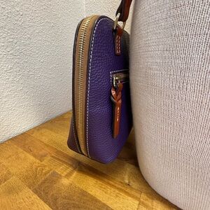 Add a rich pop of color to your wardrobe with this authentic Dooney & Bourke Mini Domed Crossbody bag. Crafted from durable and luxurious European Pebble Grain Leather in a stunning deep Plum purple, this petite yet practical bag is an everyday essential. The leather has a beautiful natural texture that resists wear, and the chestnut Vacchetta leather trim provides a classic contrast.