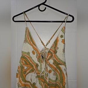 Boho style dress with floral and swirl patterns. Features strappy design and vibrant colors. Great pre-loved condition.