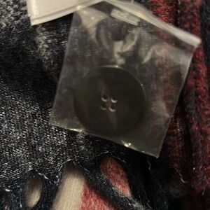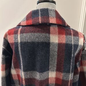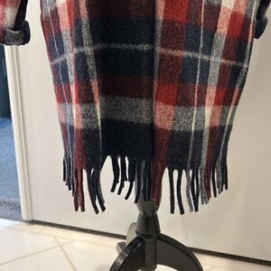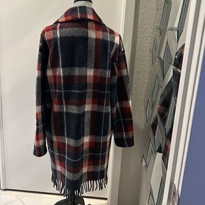 Beautiful Tahari wool blend sweater coat us red, white and navy blue. It has a frilled hemline. Collar, button down, with three buttons side pockets. Nice weight. Unlined. Underarm buttoned flat across is 22”. Length is 35” before frill. Sleeve length is 23”.