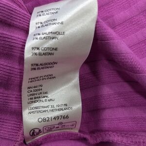 This top is a slim-fitting, hip-length style made from a stretchy, ribbed knit fabric (97% cotton, 3% elastane). It features a scoop neckline and a full button-front closure.