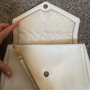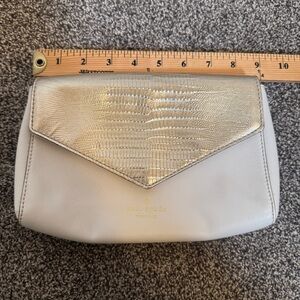Chic Kate Spade New York clutch in a creamy ivory leather with a metallic gold embossed flap (lizard-style texture). Classic envelope silhouette—great as a clutch for events or everyday minimal carry.