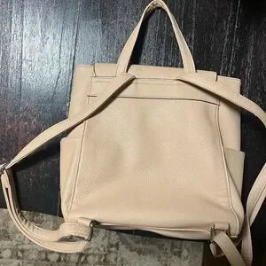 Nanette Lepore Convertible Backpack, identified by its distinctive "n" logo hardware and beige or tan faux leather material. The bag is designed for versatility, featuring adjustable and sometimes detachable straps that allow it to be carried as a backpack, shoulder bag, or crossbody bag.