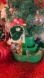 Hand Crafted. Crochet hand knit green dolly made into hat for this beaded dancer white tutu skirt made with white yarn hand knit crochet handpainted wooden face w hand knit crochet green and white holiday beanie hat, and upcycled multicolor plastic beads color in beads are gold, bronze, clear, and yellow