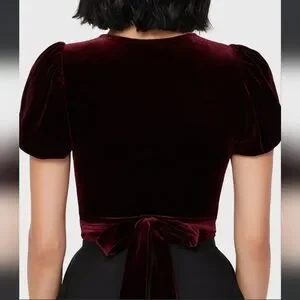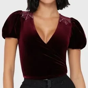 Elegant burgundy velvet top. Features spiderweb embroidery on shoulders. Puff sleeves and deep V-neckline.