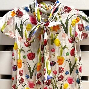 Elegant blouse with floral print. Features a stylish bow tie neck. Ideal for a chic ensemble.