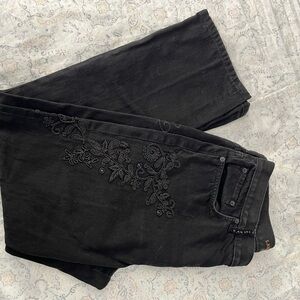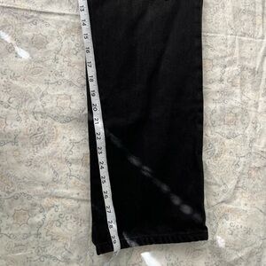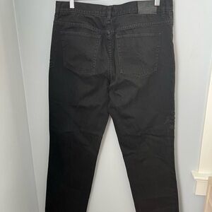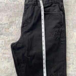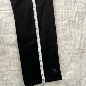 These jeans feature a sleek straight leg cut in a deep black hue, offering a timeless and versatile style. Crafted from smooth denim, they provide a comfortable fit perfect for various occasions.