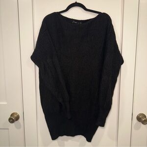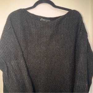 Classic and timeless black ribbed sweater dress by Theory. Made from a soft wool blend for warmth and comfort, this dress features a loose silhouette for an overall relaxed fit. Boat neckline. Hits above the knee (depending on height).