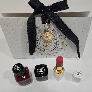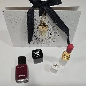 CHANEL MAKEUP BUNDLE: 922 PASSION PINK Rouge Coco Hydrating Tinted Lip Balm and Chanel Le Vernis 153 POMPIER (raspberry red shade) Longwear Nail Polish. Coming with Chanel Holiday Camelia Charm and Holiday Origami Bag.