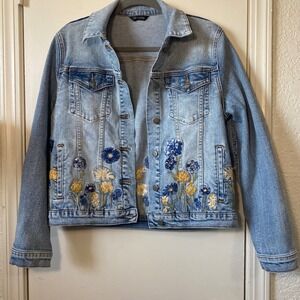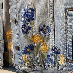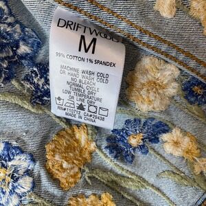 Keywords: denim jacket, jean jacket, embroidered jacket, floral jacket, Driftwood, blue denim jacket, yellow floral, womens jacket, medium jacket, casual jacket, outerwear, coat, spring jacket, fall jacket
