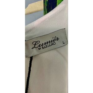 This Bariano dress features a white color, an abstract print, sleeveless arms, a ruffle hem and a mini length.