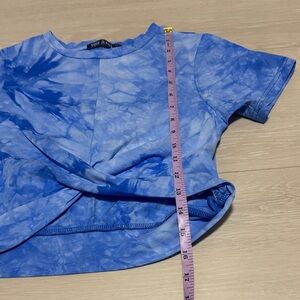 Add a splash of color to your wardrobe with this Voir blue tie-dye twist front crop top, perfect for casual summer outings.