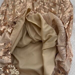Beautiful Aster halter-neck cocktail dress in size Large — perfect for weddings, holiday parties, cocktail events, or special occasions! Neutral champagne/nude base with intricate gold/bronze sequin details. Gorgeous silhouette and excellent condition. True to size and elegant on the body.