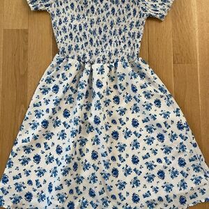 Adorable white dress that is off the shoulders with blue floral patterns. It is a size medium and the torso area is super comfortable and stretchy. Worn only once so it’s in brand new condition. The armpit to armpit length is about 14 inches but keep in mind that it stretches.