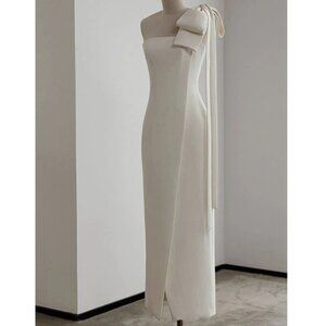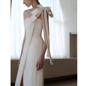 Statement Detail: The shoulder is adorned with a large, stunning oversized bow with long, trailing ribbons that fall down the back.