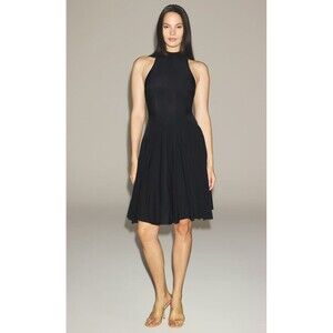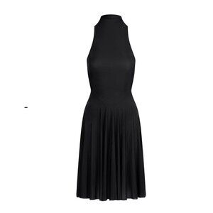 Elegant black midi dress. Sleeveless with a high neckline. Flared skirt design.