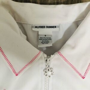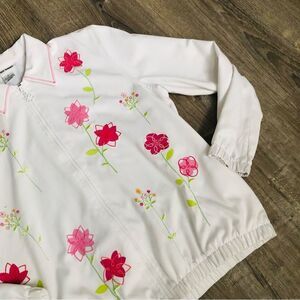 Womens Alfred Dunner White Floral Embroidered Beaded Long Sleeve Lightweight Full Zip Up Jacket. Size Small. Hand Pockets. Elastic Waostband. No rips, tears or stains. Pit-to-pit 20", Collar-to-Hem 24".