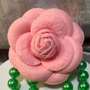 Elegant pink felt flower hair clip paired with a green beads. A stylish accessory duo.