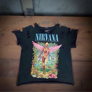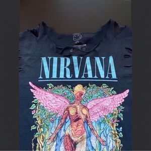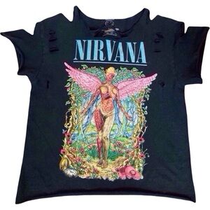 Black Nirvana band tee featuring In Utero graphic with “NIRVANA” printed in light blue across the top. This piece has been hand-distressed with intentional rips and tears for a raw, authentic grunge look — no two are alike.