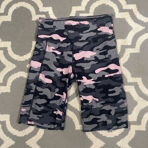 Stylish bike shorts with a pink and gray camo design. Perfect for active wear.